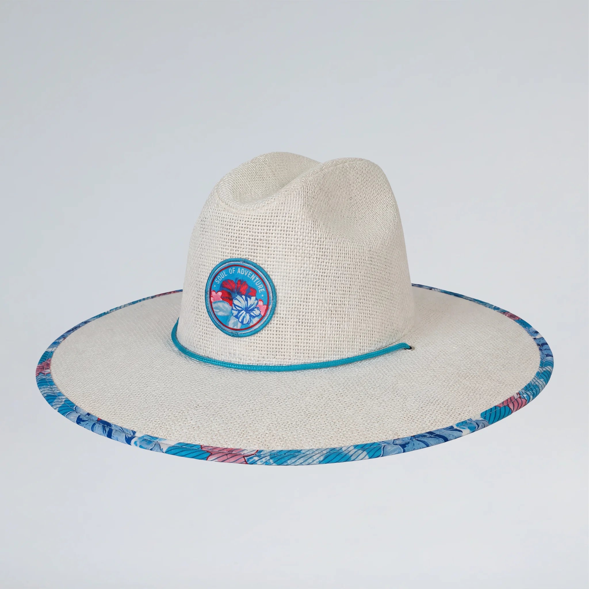 Premium synthetic straw, machine-woven for durability that holds its shape through long days in the sun. Finished with a 100% polyester under brim and a custom color story that's all its own.