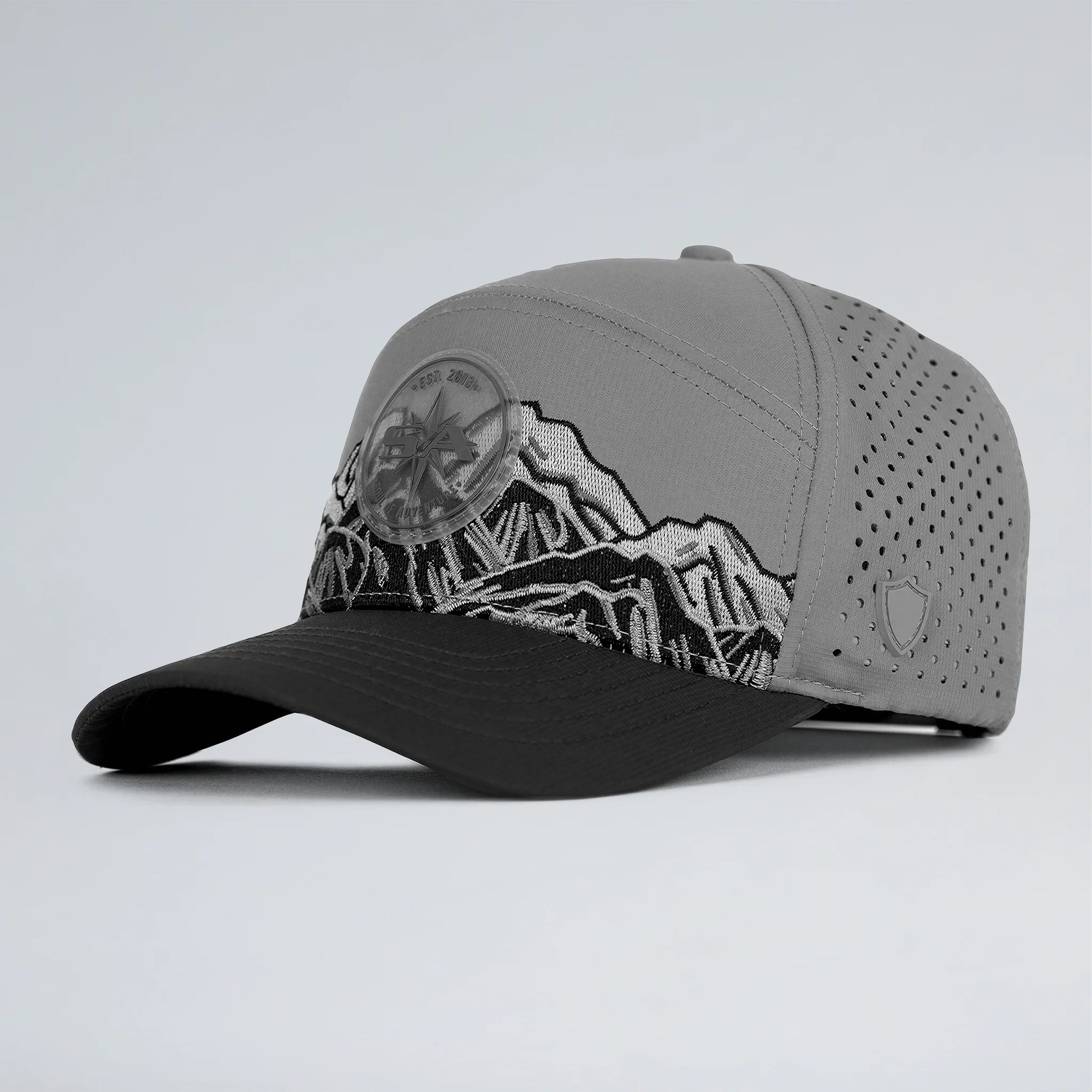 100% polyester ripstop shell with water-repellent panels and premium high-density embroidery on the front — raised, defined, and built to stay that way. Laser perforated mesh back panels and a moisture-wicking sweatband keep air moving and heat out all day.